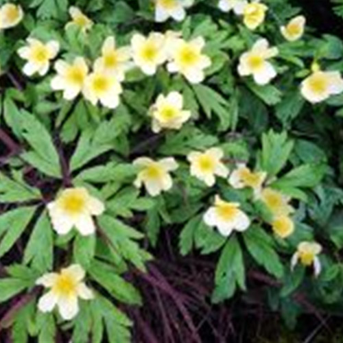 A ranunculoides Delicate cream yellow flowers over finely divided dark green leaves