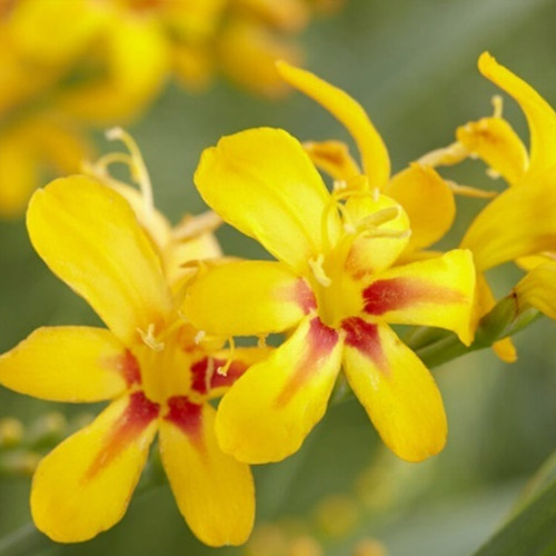 The very best of the yellow crocosmias. Early flowering arching sprays of large rich-yellow flowers in dense heads that face upwards
