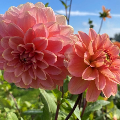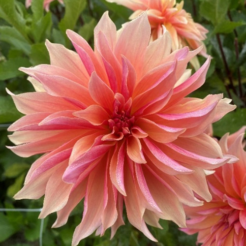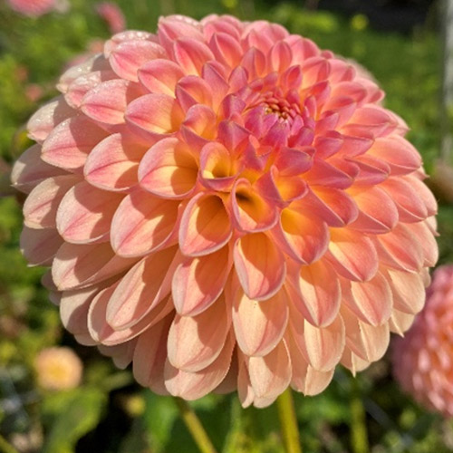 Fully double big flower with lovely informal petal shape of glowing peach pink and hints of orange
