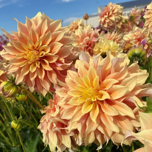 Large fully doubled flowers with apricot- orange petals.