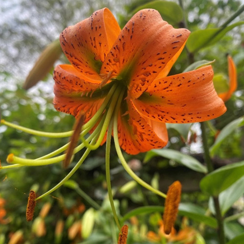 Hanging, bright orange-red reflexed flowers with numerous brown to black spots.